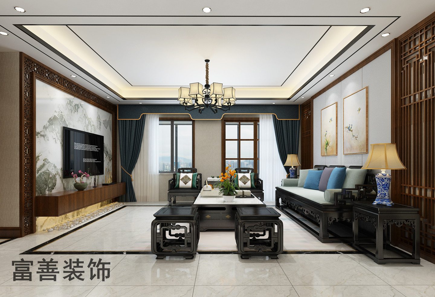 ??诟簧蒲b飾通過與客戶充分的溝通,了解客戶的實(shí)際需求后,根據(jù)新中式風(fēng)格的設(shè)計(jì)思想,為客戶設(shè)計(jì)出具有中式元素和現(xiàn)代簡(jiǎn)約元素相融合的平面效果圖;如下: